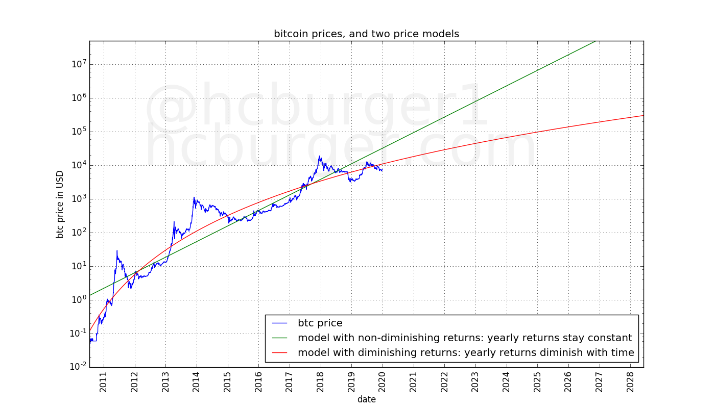 The profiles of the expected returns are very different for the model with diminishing compared to the model with non-diminishing returns. The difference is extremely important to anyone who invests in bitcoin. Which of the two models better reflects reality?
