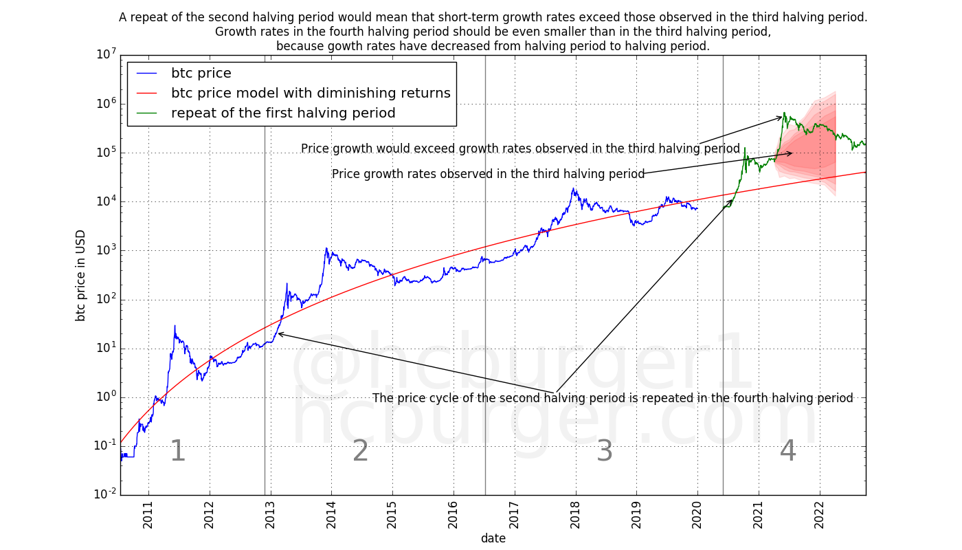 We can also ask ourselves if it is possible for history to repeat itself. E.g. could the price movements observed in the first halving period repeat themselves after the next halving?