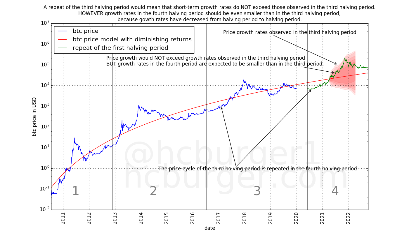 Assuming 0 price growth until the third halving, and using extrapolated statistics for the fourth halving period, we get the following possible price movements.