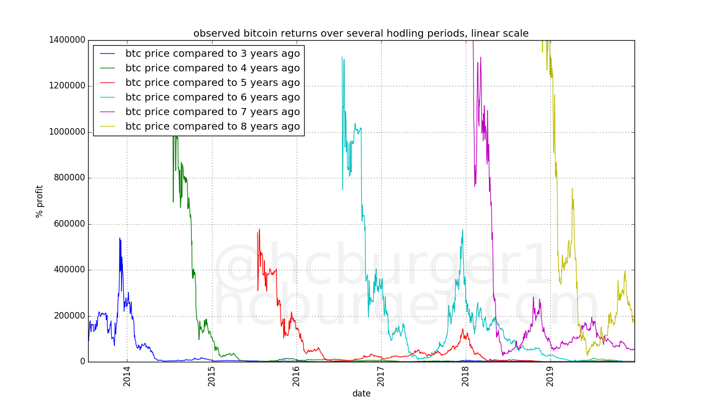 This is demonstrated in the plot below. Each colored line represents one hodling period. The x-value of each point on the line represents the time at which the investor sold his bitcoin. The y-value represents the percent profit he made from his investment.