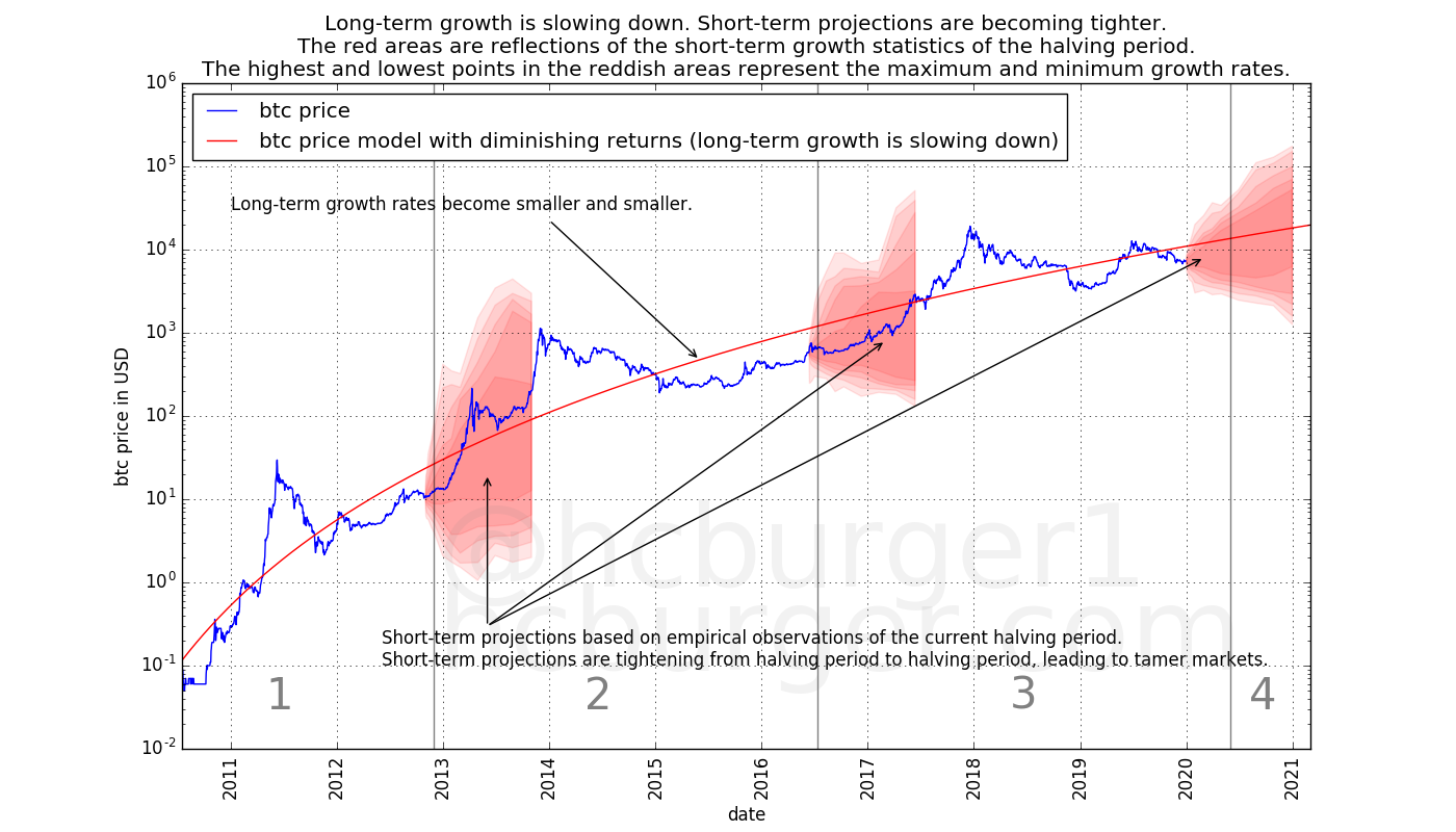 The conclusions regarding long-term diminishing returns were already drawn in “Bitcoin’s natural long-term power-law corridor of growth” but we have looked at this effect in a novel way in this article, and have also seen that the effect would have been visible as early as 2014, or maybe even earlier. Also different from the previous article is that we arrive to similar conclusions without using a precise model. The general conclusions are therefore independent of the exact choice of the model.